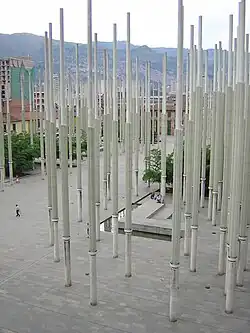 El diseño de la nueva plaza de Cisneros realizado por Juan Manuel Peláez y modificado en repetidas ocasiones, cuenta con un gran bosque artificial de 300 postes con una altura máxima de 24 metros, cada uno de ellos con una base de concreto de 4 metros y otros 18 metros en estructura metálica, que iluminan la noche con 2100 reflectores en total (siete en cada torre), y a las que apoyan 170 lámparas de piso. De la misma manera, en la plaza hay fuentes de agua, guaduas (un tipo de bambú), pisos en plataformas de varios niveles y el sistema de iluminación computarizado que simula las fases de la luna.[5]