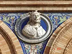 Como ocurre en la Plaza Mayor de Salamanca desde el siglo XVIII,[31] en las enjutas de los arcos que recorren la plaza sevillana se distribuyen medallones con retratos en blanco sobre fondo azul. Son un total de 52 relieves cerámicos. Los representados se destacaron en la historia de España: Séneca, San Isidoro, Don Pelayo, El Cid Campeador, Jaime I el Conquistador, Fernando III el Santo, Raimundo Lulio, Alfonso X el Sabio, Cristóbal Colón, Antonio de Marchena, los hermanos Pinzón, Isabel la Católica, Gonzalo Fernández de Córdoba, Luis Vives, el cardenal Cisneros, Carlos I, Hernán Cortés, Francisco Pizarro, Fernando de Magallanes, Bartolomé de las Casas, fray Luis de León con fray Luis de Granada, Diego Hurtado de Mendoza, Fernando de Rojas, San Francisco Javier, Santa Teresa de Ávila, San Juan de la Cruz, Felipe II, El Greco, Lope de Vega, Diego Velázquez, Francisco de Quevedo, Calderón de la Barca, Miguel de Cervantes, Luis de Góngora, Alonso de Ercilla, Juan Martínez Montañés, José de Ribera, Bartolomé Esteban Murillo, Francisco de Zurbarán, Alonso Cano, Tomás Luis de Victoria, Francisco de Goya, Mariano Álvarez de Castro, Mariano Fortuny, Eduardo Rosales, Emilio Castelar, Jacinto Verdaguer, Marcelino Menéndez Pelayo, Andrés Manjón y Manjón y Joaquín Sorolla.[5]