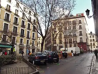 Répide, describiendo el trazado de la plaza, documenta en el siglo xvii la apertura del pasaje de san Felipe Neri, luego calle, por influencia del convento dedicado a ese santo italiano y con puertas a la calle Mayor.[4] También estuvo en este lugar emplazado un mercado (ya desmontado antes de 1889) y una fuente del viaje de la Reina,[3] que se conservó hasta mediado el siglo xx. Quedan registradas en su entorno construcciones particulares ya desde 1739.[3]