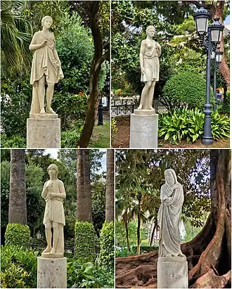 Talladas en mármol blanco a una escala menor a la real, todas visten togas o túnicas romanas y se exhiben sobre pilares cilíndricos.