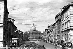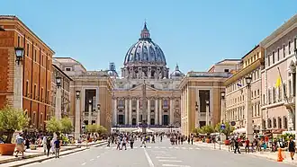 ![]() La plaza de San Pedro, la columnata de Bernini y la Via della Conciliazione, junto con el rione de Borgo, vistos desde la basílica. | ||