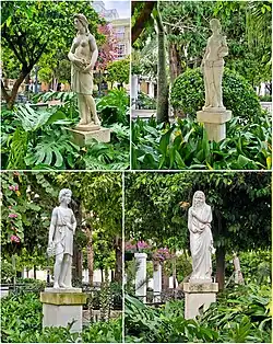 Además de la estatua a Emilio Castelar, la plaza cuenta con un grupo escultórico Las Cuatro Estaciones, muy de moda desde finales del siglo XVIII para decorar parques, jardines y palacios.