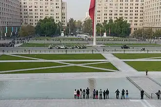 Es una explanada que incluye en el sector norte dos espejos de agua que evocan un foso, dos líneas de fuentes y las estatuas a los presidentes de Chile Arturo Alessandri y Patricio Aylwin, así como subterráneamente el Centro Cultural La Moneda y estacionamientos públicos. Al centro, tiene césped con sendas y es intersecada por la Avenida Libertador General Bernardo O'Higgins (Alameda), donde hay un óvalo con el mástil que porta la Bandera Bicentenario, un pabellón chileno monumental. En la zona sur, está el Altar de la Patria: la cripta de Bernardo O'Higgins y un pequeño museo histórico, así como un monumento ecuestre a él —obra del francés Albert-Ernest Carrier-Belleuse— y a José Miguel Carrera —obra del local Samuel Román—, flanqueados por ocho banderas nacionales y árboles.[2]