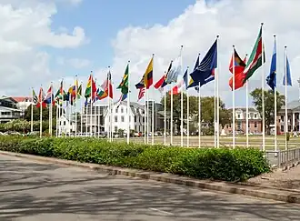 La plaza durante el periodo de la Guayana Neerlandesa era denominado como plaza Naranja o plaza de Gobierno.[1] Desde el 24 de febrero de 2012 la plaza ocupa toda las banderas de los integrantes de la Comunidad del Caribe por lo que también recibe el nombre de plaza de la Bandera.[2]