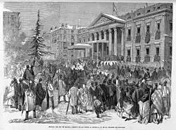 En el siglo XIX la plaza forma parte del "Barrio de las Cortes".[2] El edificio del Congreso de los Diputados inaugura las obras el 10 de octubre de 1843 mediante la colocación de la primera piedra por Isabel II. Las obras se realizan de acuerdo con los planos diseñados por Narciso Pascual y Colomer y finalizan en 1850. Las primeras sesiones se realizan el 3 de noviembre. En el número 8 de la plaza vivió el poeta Ramón de Campoamor. En el jardín central de la plaza había dos grandes eucaliptos que fueron destrozados en el ciclón de 1886. En 1834 se coloca la estatua de Cervantes en la plaza; dicha estatua fue costeada por el comisario de Cruzada Manuel Fernández Varela. El Hotel Palace, ubicado en el n.º 7 de la plaza, fue construido durante el periodo 1911-1912 por Leon Monnoyer et Fils.