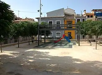 La plaza, de forma rectangular, está elevada y rodeada de casas de estilo mediterráneo con fachadas coloridas. Cuenta con arena de coso, una zona de juegos infantiles y varios árboles que aportan sombra y crean un entorno agradable para los visitantes. En sus alrededores, la plaza se integra en la animada zona de ocio nocturno conocida como El Barrio.[1]