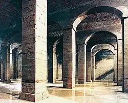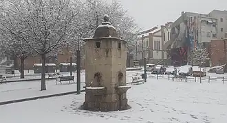 La plaza dispone de un depósito subterráneo de planta cuadrada formado por 25 pilares que sustentan la bóveda de 5 naves con 35 arcos. El depósito se traduce en el exterior mediante un respirador que sirve también de fuente pública.[1]