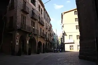 La plaza del Mercado, frente a la puerta lateral de la iglesia de San Miguel, es muy característica por sus porches. Esta galería, cubierta a modo de soportales para el cobijo de las actividades comerciales, se convierte en el transcurso de la Baja Edad Media en el centro por excelencia de la villa y punto de concentración de las casas de los aldeanos más acomodadas, siendo relevada como centro vital de la villa en siglos siguientes por el ensanchamiento de la plaza de la Feria.[1]