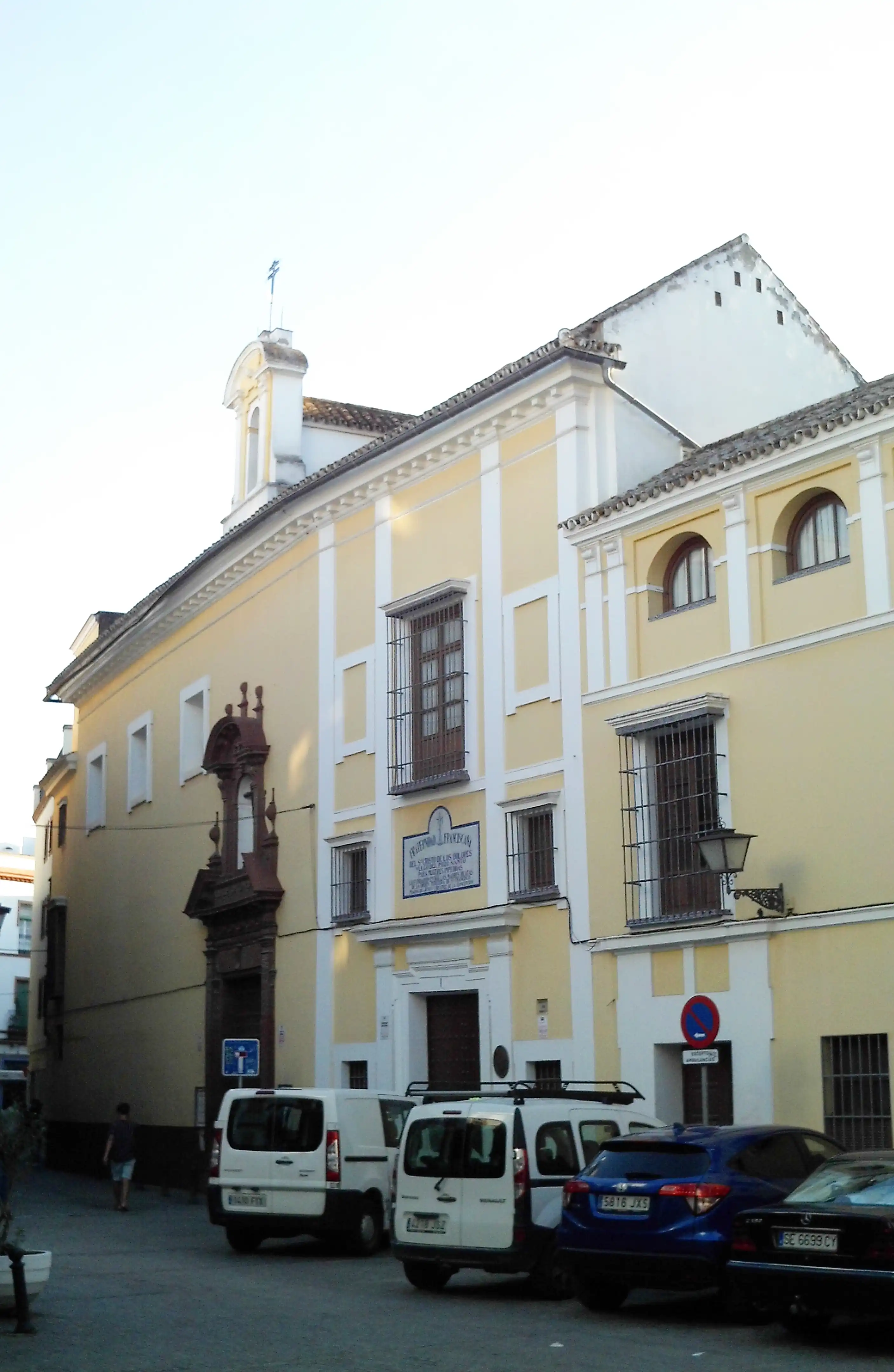 Plaza del Pozo Santo. Corresponde al cuartel C. y á la parroquia de san Andres. Su nombre la toma del conocido milagro que hizo la santisima Virgen, en la esquina que mira al Norte. En este sitio estaba una pintura de Ntra. señora y al pie un pozo público en el cual por descuido casual cayó un niño y ó el mismo clamó, ó sus padres lo encomendaron á la señora en aquella pintura, y continuando en su oracion vieron que las aguas del pozo subian con el niño hasta llegarlo al brocal donde sus padres lo recogieron salvo y sano. Esto movió á los cofrades del antigüo é ínmediato hospital de la Misericordia á que llevasen la citada imágen dentro de su iglesia y la colocasen en su altar mayor pintando el milagro en el mismo cuadro, y levantando sobre el pozo una cruz y cercándola de rejas como existe, dejando á la posteridad el nombre del pozo Santo para eterna memoria del milagro. Este nombre de Santo se le dió al pozo, y del pozo Santo tomó el nombre la plaza, y despues el hospital que se fundó en ella. El cual se estrenó el dia 18 de Enero de 1682, si bien ya se ejercia su instituto algunos años antes en una casa en la calle de la Benera. Careció su iglesia (que está dedicada al santo Cristo de los dolores) de sacramento cuatro años hasta el de 1686, que lo consagró y colocó en sus sagrario el señor Arzobispo D. Jaime de Palafox. Su fundacion fué por dos devotas mugeres naturales la primera de Cabrilla llamadas la madre Marta, y la otra María Beatriz Gerónima de la Concepcion, esta segunda Sevillana; ayudadas de la señora doña Ana Trujillo que les dió todo su caudal. Su instituto utilísimo, es para recoger mugeres impedidas, cuyo cuidado y hospitalidades está al cargo de varias beatas que visten y profesan el hábito y regla del O. T. de san Francisco. Su templo es muy pequeño y su fachada de ladrillo cortado es regular, y sobre la puerta de la casa está escrito lo siguiente: JESUS BARON DE DOLORES CASA DE DIOS, Y PUERTA DEL CIELO, ESTE LUGAR ES SANTO Y YO NO LO SABIA, ES ESTE MISMO DIOS ALTISIMO FUNDO CASA Y HOSPITALIDAD DE POBRES MUGERES INCURABLES. ES DEL SANTO CRISTO DE LOS DOLORES. ACABOSE AÑO DEL SEÑOR DE 1680. RENOVOSE EL DIA DE LA NATIVIDAD DEL SEÑOR DE 1832. El citado pozo está cubierto, y en la octava de la Asuncion de Ntra. señora lo abren y se veven sus aguas sin que en la plaza halla nada mas que observar: la cual es pequeña y está á la salida de la calle de la Misericordia.(González de León, 1839, pp. 113-114)