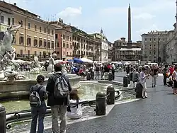 Tres fuentes barrocas adornan la plaza: la Fuente de los Cuatro Ríos de Gian Lorenzo Bernini en el centro, la Fuente del Moro y la Fuente de Neptuno en el otro extremo. Se destaca la iglesia de Sant'Agnese in Agone de Francesco Borromini, restaurada en 2006-2007, una de las mayores obras del barroco romano. Los dos grandes artistas fueron encarnizados rivales y hay quienes creen reconocer en el gesto de una de las estatuas de la fuente central, el Río de la Plata, un mensaje de desprecio o burla de Bernini sobre la estabilidad precaria de la iglesia. La historia es divertida y seguramente falsa: la fuente inaugurada en 1651, fue en realidad realizada antes que Sant'Agnese, comenzada en 1652. La plaza está siempre repleta de gente tanto de día como al atardecer, principalmente turistas y vendedores de recuerdos. Durante la Navidad en ella se monta un mercado callejero donde se venden pesebres y estatuillas del pesebre.