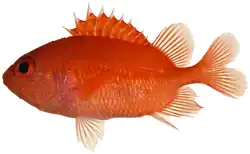 Cuerpo comprimido lateralmente característico de la familia, con una longitud máxima descrita de 15 cm.[2] El color es un brillante rojo anaranjado, con las espinas que hay cerca del preopérculo algo agrandadas, suaves aletas dorsal, anal y caudal sin escamas y con sus lóbulos anchamente redondeados.[1] Los huesos que rodean el ojo tienen finas espinas, las inferiores apuntando hacia el ojo.[3] Posee 12 espinas en la aleta dorsal y 4 espinas en la aleta anal.[1]