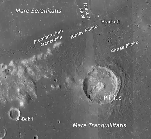 Plinius es un destacado cráter de impacto de la Luna situado en la frontera entre el Mare Serenitatis, al norte, y el Mare Tranquillitatis, al sur. Al sursureste de Plinius se encuentra el cráter Ross y al noreste el cráter Dawes. Justo al norte se localiza un sistema de rimas denominado Rimae Plinius. En el extremo noroeste de la rima se halla el Promontorium Archerusia, un saliente del borde occidental que rodea al Mare Serenitatis.