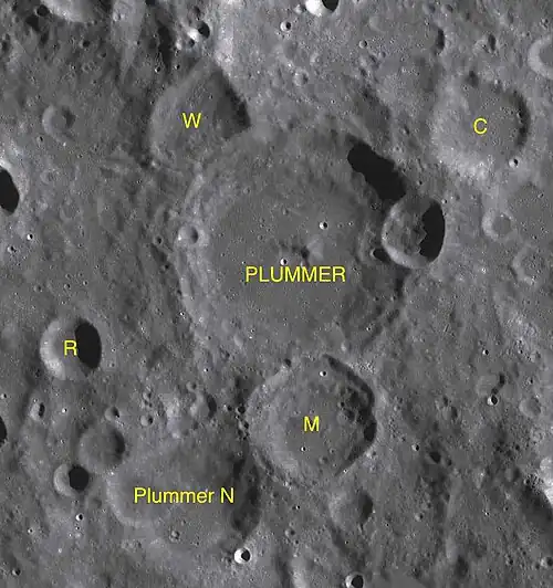 Plummer es un cráter de impacto lunar. Se encuentra en la cara oculta de la Luna, al norte de la enorme planicie amurallada del cráter Apolo. A menos de un diámetro de Plummer hacia el norte se halla el cráter Wilsing, de tamaño similar.