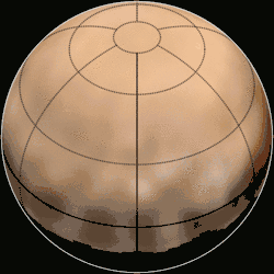 El periodo de rotación de Plutón es igual a 6.39 días terrestres (153 horas con 21 minutos).[73] Al igual que Urano, Plutón gira acostado sobre un lado en su plano orbital, con una inclinación axial de 120°, por lo tanto, su variación estacional es extrema. Durante los solsticios plutonianos, en una cuarta parte de la superficie es continuamente de día mientras que en otra cuarta parte es noche continua.[74]