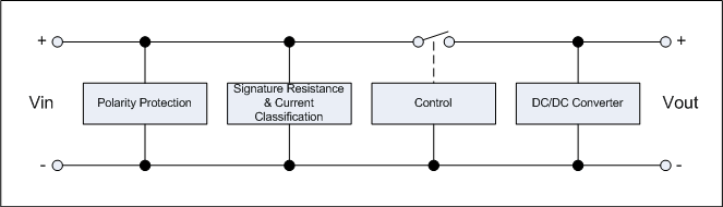 • Primer bloque: “Polarity Protection” o “Auto-polarity Circuit”. Como indica la norma, la tensión introducida puede venir de dos formas: una de las formas consiste en usar los par de datos del cable de Ethernet como fuente de alimentación. Dicha forma permite transmitir datos y alimentar a la vez por los mismos pares. La segunda forma usa otros pares alternativos para enviar la tensión. La ventaja de la primera forma es que usa solo dos pares, en vez de 4, que son los necesarios para implementar la segunda forma (El cable Ethernet tiene 4 pares en su interior).