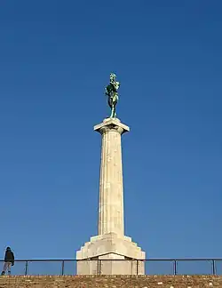 El monumento El Vencedor fue erigido en 1928 en la Zona alta de la Fortaleza de Belgrado con motivo del décimo aniversario de la victoria en el frente de Salónica. El monumento consta de una figura masculina de bronce, con un águila en la mano derecha y una espada bajada en la izquierda, trabajo del escultor Ivan Meštrović, que descansa sobre el pedestal diseñado como una columna dórica con acanaladuras y situada en una alta base cúbica, obra del arquitecto Petar Bajalović.[2]