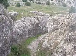 En los laterales se aprecian unas hendiduras en la piedra que presumiblemente servirían para introducir trancas de madera y sujetar así las ruedas evitando el deslizamiento por la pendiente. En la meseta se pueden observar habitaciones excavadas en la roca, escaleras, y numerosos depósitos (más de 100), el mayor llamado "El Trinquete" de 29 x 5 m, con una profundidad estimada de 14 m (más de 2000 m³). No todos los depósitos serían aljibes, ya que algunos pudieron ser utilizados como graneros o almacenes.