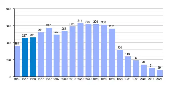 | Gráfica de evolución demográfica de Pobladura de Valderaduey[9] entre 1842 y 2021 |