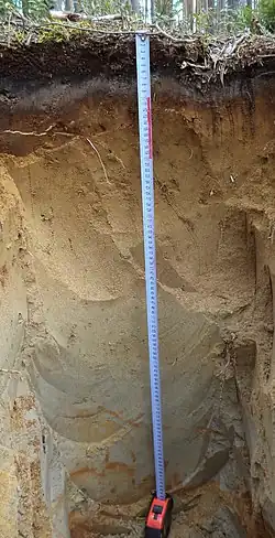 El podsol es un tipo de suelo característico de climas fríos y húmedos (Canadá, Escandinavia y Rusia septentrional) o templado frío (vertiente atlántica de Europa y Tierra del Fuego), con abundantes precipitaciones, que se caracteriza por una alta lixiviación, que propicia que una gran cantidad de sustancias superficiales migren a niveles inferiores. El horizonte B se caracteriza por un alto depósito de óxidos, que confieren a esta capa unas tonalidades rojizas características, y de materia orgánica negra.