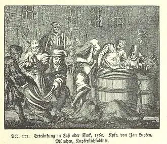 El último caso donde este castigo es, según algunos, supuestamente ejecutado, es en 1734, en algún lugar de Sajonia.[38] Otra tradición, sin embargo, se evidencia en la ciudad sajona de Zittau, donde el último caso se supone que ocurrió en 1749. En al menos un caso en Zittau 1712, y se utilizó una serpiente colubrida no venenosa. El ritual de Zittau consistía en poner a las víctimas en un saco negro y mantenerlas bajo el agua durante no menos de seis horas. Mientras tanto, los chicos del coro en la ciudad tenían el deber de cantar el Salmo compuesto por Martín Lutero, Aus tiefer Not schrei ich zu dir (De la profunda aflicción te grito).[39] El castigo del saco fue abolido expresamente en Sajonia en un rescripto del 17 de junio de 1761.[36][40]