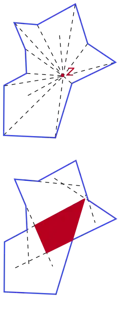 Formalmente, un polígono P tiene forma de estrella si existe al menos un punto z tal que para cada punto p de P el segmento se encuentre completamente dentro de P.[1] El conjunto de todos los puntos z con esta propiedad (es decir, el conjunto de puntos desde los cuales todo P es visible) se denomina núcleo de P.