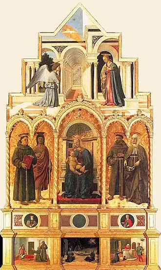 Su parte superior, una Anunciación, es la más conocida. Demuestra la maestría de Piero della Francesca en las reglas (nuevas) de la perspectiva. A la impostación tardogótica pedida por los comitentes y que domina las otras partes del retablo, se contrapone esta Anunciación del gablete, de clara estampa renacentista, con una extraordinaria fuga en perspectiva sobre los arcos del fondo. Sorprende esta perspectiva arquitectónica magistral.