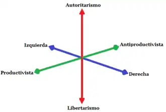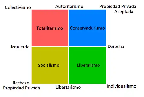 En contraste, los partidos políticos concentran su actividad en lograr representación institucional, ya sea mediante el parlamento u otros niveles de gobierno. Su acción política incluye intervenciones mediáticas, actos proselitistas y actividades públicas orientadas a promover su programa, ideales y principios. Además, los partidos suelen recibir regulación, privilegios e incluso financiamiento estatal, lo que depende de las leyes y libertades públicas vigentes en cada país, así como del sistema electoral establecido.[43][44][45][46]Todas las ideologías políticas se agrupan en torno a dos dimensiones que son la económica y la social. La dimensión económica está integrada por dos ideologías opuestas, izquierda-derecha, que forman una línea horizontal y la dimensión social está integrada por otras dos ideologías opuestas, autoritarismo-libertarismo,[48][49][50] que forman una línea vertical. Juntas estas dos dimensiones integran un mapa ideológico en el cual podemos encontrar cuatro grandes sistemas como el totalitarismo, conservadurismo, socialismo y el liberalismo, y el punto en donde se cruzan las dos líneas se considera como el centro político.[49][50]