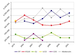| PSOE | 622.971 | 808.350 | 663.837 | 510.114 | 496.773 | 534.700 | 625.148 | 486.826 | 364.600 | 249.152 | 223.582 |