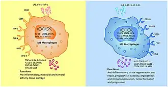Los macrófagos M1 se describieron como del tipo proinflamatorio, importante en la defensa directa del huésped contra patógenos, como la fagocitosis y la secreción de citocinas proinflamatorias y moléculas microbicidas. Se describió que los macrófagos M2 tienen una función totalmente opuesta: la regulación de la fase de resolución de la inflamación y la reparación de los tejidos dañados. Más tarde, estudios in vitro y ex vivo más extensos han demostrado que los fenotipos de macrófagos son mucho más diversos, superpuestos entre sí en términos de expresión y función génica, revelando que estos muchos estados híbridos forman un continuo de estados de activación que dependen del microambiente.[3][4][5][6] Además, in vivo, existe una gran diversidad en el perfil de expresión génica entre diferentes poblaciones de macrófagos tisulares.[7] Por tanto, se considera que el espectro de activación de los macrófagos es más amplio e implica una vía reguladora compleja para responder a una plétora de señales diferentes del entorno.