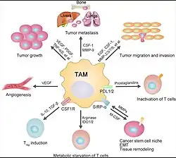 Los macrófagos asociados a tumores (TAM) son típicos por sus funciones protumorales como la promoción de la motilidad de las células cancerosas, la formación de metástasis y la angiogénesis y su formación depende de factores microambientales que están presentes en el desarrollo del tumor. Los TAM producen citocinas inmunosupresoras como IL-10, TGFβ y PGE2, cantidades muy pequeñas de NO o ROI y niveles bajos de citocinas inflamatorias (IL-12, IL-1β, TNFα, IL-6). Se reduce la capacidad de los TAM para presentar antígenos asociados a tumores, así como la estimulación de las funciones antitumorales de las células T y NK. Además, los TAM no pueden lisar las células tumorales. La selección de TAM puede ser una estrategia terapéutica novedosa contra el cáncer, como se ha demostrado mediante la administración de agentes para alterar el reclutamiento y distribución de TAM, agotar los TAM existentes o inducir la reeducación de TAM de un fenotipo M2 a M1.