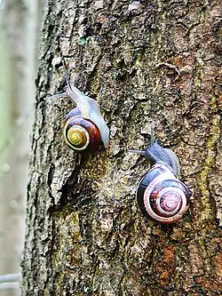 Un sistema similar de polimorfismo genético sucede con el caracol rayado de labio blanco (Cepaea hortensis), un pariente cercano del caracol rayado. En Islandia donde no hay zorzales, se ha establecido una correlación entre la temperatura y las morfos de color. Los morfos pardos y rayados alcanzan temperaturas más altas que los morfos sin bandas y los amarillos.[47] Lo que puede ser la base de la selección fisiológica de ambas especies de caracol.