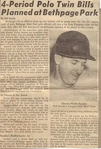 A finales de la década de 1950, el jugador de polo campeón y director de la Asociación de Polo de Long Island, Walter Scanlon, introdujo el juego de polo de "forma corta" o estilo "europeo" de cuatro períodos.