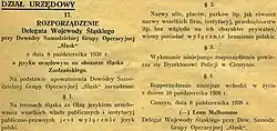 Una ley promulgada en 1924 prohibía el uso de cualquier idioma excepto el polaco en los documentos gubernamentales y municipales. En el área de la educación pública se postuló que las escuelas estatales sólo podrían usar la lengua polaca.[44] La población local podría tener escuelas privadas en el idioma local, pero solo en los territorios leales al estado polaco. Específicamente con respecto a las regiones orientales (conocidas como Kresy Wschodnie o "Tierras de frontera oriental") se reconoció que las escuelas pueden convertirse en un instrumento de desarrollo cultural en las tierras orientales sólo si trabajan en ellas profesores polacos. Esto resultó ser irrealizable y, en casos particulares, se propusieron escuelas bilingües ("escuelas utraquistas", szkoły utrakwistyczne), mientras que en realidad las escuelas funcionales eran en las que se usaba el polaco.[44]