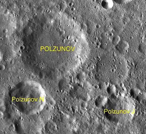 Polzunov es un cráter de impacto que se encuentra justo al sursureste del cráter más grande Seyfert, en la cara oculta de la Luna. A alrededor de un diámetro del cráter al oesudoeste se encuentra Deutsch, y un poco más al sursureste se halla Olcott.