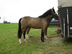La cabeza presenta un perfil cóncavo, frente abombada y orejas pequeñas, tiene el cuello de longitud media, las espaldas inclinadas y dorso musculado. La grupa inclinada con una cola de inserción alta. Sus extremidades son finas pero resistentes, y los cascos pequeños y duros.