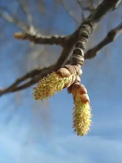 - Flores masculinas son grandes y rojizas, en amentos colgantes, flores femeninas son de color amarillo-verdoso sobre pies separados.