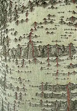 - Árbol caducifolio de rápido crecimiento, de hasta 30 m de altura y 1 m de diámetro, de forma ancha y columnar, de grueso tronco y sistema radical fuerte, con numerosas raíces secundarias largas que emiten multitud de renuevos. Corteza lisa, blanquecina, gris, fisurada, más oscura en la base, con las cicatrices negruzcas de antiguas ramas.