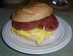 Conocido como Jersey breakfast (‘desayuno de Jersey’),[6][7][8] el sándwich de pork roll, huevo y queso es una receta básica de muchas tiendas de alimentación, diners y panaderías de Nueva Jersey. El pork roll también puede usarse en muchas otras recetas.[9][10]