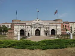El bloque que componía la estructura de la puerta daba la impresión de formar parte de los muros, ya que no se proyectaba hacia los lados más allá del muro cortina y su altura era particularmente limitada, lo que la hacía menos vulnerable al fuego de artillería enemigo. El bloque tenía dos torres circulares a los lados, utilizadas por los centinelas, cuya forma permitía una excelente vista de los alrededores. La parte superior descubierta de la puerta se utilizó como caballero (según Scipione Maffei este sería "el primer ejemplo de la puerta que sirve a la vez como caballero"): esto explica la considerable anchura de la puerta, necesaria para maniobrar la artillería, y el grosor de los muros y pilares, necesarios para soportar su peso y las vibraciones de los disparos de los cañones.