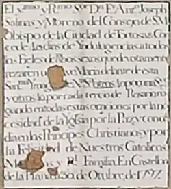 Estas indulgencias fueron dadas por el obispo de Tortosa de origen castellonense José Salinas y Moreno en 1797 y se mandó transcribirlas en una placa cerámica de 45 x 95 cm conformada por vía húmeda y deorada a mano alzada sobre estarcido.[7] Su texto dice lo siguiente: