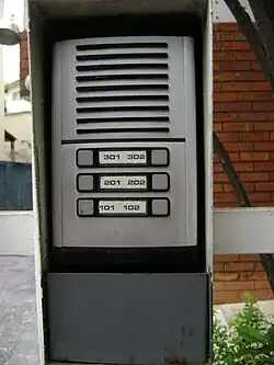 El portero electrónico, portero eléctrico, electroportero, portero automático, citófono, telefonillo, fonoporta, interfón o interfono es un conjunto de elementos eléctricos y electrónicos destinados a gestionar las llamadas a la puerta de entrada de una vivienda[1] o de un edificio en general.[2]