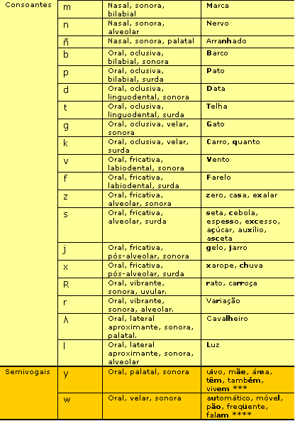 | Semivocales | /j/ ~ /ȷ̃/ | Oral, palatal, sonora | uivo, mãe, área, têm, também, vivem. |