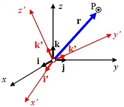 Cuando el movimiento de la partícula se describe a un sistema de referencia móvil (x,y,z) en rotación con respecto de un referencial fijo (X,Y,Z) con el que comparte el mismo origen, el vector de posición será el mismo en ambos referenciales y vendrá expresado por: