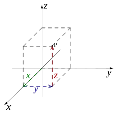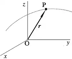 Podemos representar la posición de una partícula o de un punto del espacio, respecto de un sistema de ejes, mediante las coordenadas cartesianas (x,y,z) del punto, o mediante el vector de posición de dicho punto respecto al origen "O" del sistema de coordenadas (Figura 1). Dicho vector de posición se define como el vector que tiene como origen el punto "O" y como extremo el punto "P", es decir, el vector aplicado en el punto "O" que tiene como componentes las coordenadas cartesianas x, y, z, del punto "P". Escribiremos