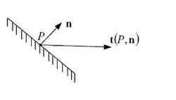 Sea t el vector de tracción que actúa en el punto P considerado como parte del contorno del primero de estos volúmenes materiales. En principio este vector de tracción (definido ahora en un punto material del interior del medio continuo original) dependerá: