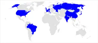 Países con armas nucleares del NPT —los miembros permanentes del Consejo de Seguridad de las Naciones Unidas— (China, los Estados Unidos, Francia, el Reino Unido y Rusia)      Otros países con armas nucleares (la India, Pakistán y Corea del Norte)      Otros países que se cree que tienen armas nucleares (Israel)      Países en la Compartición nuclear de la OTAN (Alemania, Bélgica, Italia, los Países Bajos y Turquía)      Países que alguna vez tuvieron armas nucleares (Bielorrusia, Ucrania, Kazajistán y Sudáfrica)