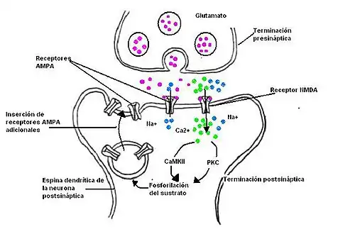 - ↑ a b Bliss TV, Collingridge GL (enero de 1993). «A synaptic model of memory: long-term potentiation in the hippocampus». Nature 361 (6407): 31-9. PMID 8421494. doi:10.1038/361031a0.