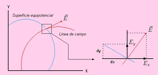 siendo el valor de la enésima carga y la distancia de la misma al punto en cuestión. La suma que se efectúa es una suma algebraica y no una suma vectorial. En esto estriba la ventaja de cálculo del potencial sobre la de intensidad del campo eléctrico. Las superficies equipotenciales cortan perpendicularmente a las líneas de campo. En el gráfico se representa la intersección de las superficies equipotenciales con el plano XY.