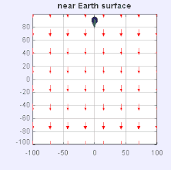 donde U es la energía potencial gravitatoria y h es la altura sobre la superficie. Esto significa que la energía potencial gravitatoria en un mapa de contorno es proporcional a la altitud. En un mapa de curvas de nivel, el gradiente negativo bidimensional de la altitud es un campo vectorial bidimensional, cuyos vectores son siempre perpendiculares a las curvas de nivel y también perpendiculares a la dirección de la gravedad. Pero en la región montañosa representada por el mapa de curvas de nivel, el gradiente negativo tridimensional de U siempre apunta directamente hacia abajo en la dirección de la gravedad; F. Sin embargo, una pelota rodando por una colina no puede moverse directamente hacia abajo debido a la fuerza normal de la superficie de la colina, que anula la componente de la gravedad perpendicular a la superficie de la colina. La componente de la gravedad que queda para mover la pelota es paralela a la superficie:
