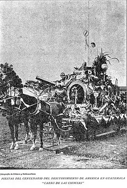 Para el día 12 de octubre se programó una procesión cívica, con participación de personajes vestidos a la usanza del siglo xv, y carros alegóricos entre los que estaban: la galera «Santa María», tripulada por Colón y sus acompañantes; carro triunfal de oro y plata, estilo griego, representando a la joven América, con todas sus riquezas y hermosura; carro de la industria, con sus trofeos, herramientas; carros de las Bellas Artes, Ciencias y Agricultura; carro representando un vapor mercante y correo; y, finalmente, carro de la apoteosis de Cristóbal Colón.[8] En el desfile participaron los empleados públicos, estudiantes de los distintos establecimientos públicos, funcionarios superiores y el ejército, que cerró el desfile.[8]